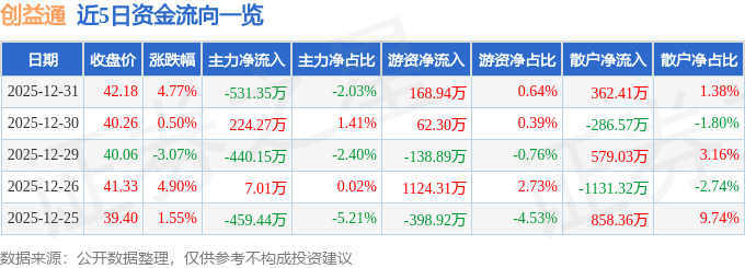 证券之星消息,截至2025年12月31日收盘,创益通(300991)报收于42.18元,上涨4.77%,换手率6.82%,成交量6.29万手,成交额2.62亿元。