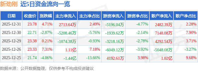 证券之星消息,截至2025年12月31日收盘,新劲刚(300629)报收于23.78元,上涨4.71%,换手率21.67%,成交量46.98万手,成交额10.89亿元。