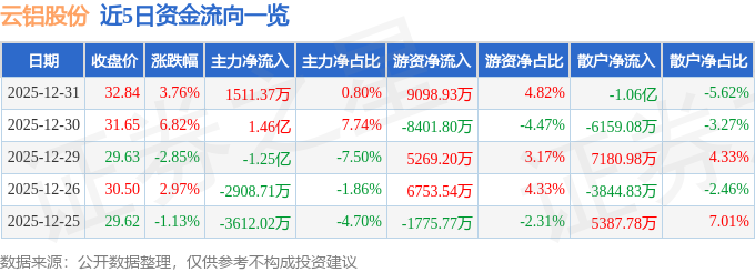 证券之星消息,截至2025年12月31日收盘,云铝股份(000807)报收于32.84元,上涨3.76%,换手率1.69%,成交量58.5万手,成交额18.89亿元。