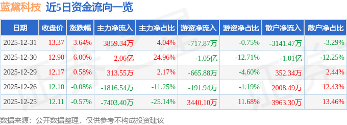 证券之星消息,截至2025年12月31日收盘,蓝黛科技(002765)报收于13.37元,上涨3.64%,换手率12.09%,成交量72.02万手,成交额9.56亿元。