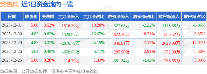 证券之星消息,截至2025年12月31日收盘,安诺其(300067)报收于5.0元,上涨3.52%,换手率3.19%,成交量29.95万手,成交额1.47亿元。