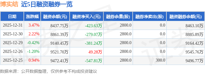 博实结融资融券信息显示,融资方面,当日融资买入1104.74万元,融资偿还1528.38万元,融资净偿还423.63万元。融券方面,融券卖出0.0股,融券偿还0.0股,融券余量2800.0股,融券余额25.35万元。融资融券余额8463.1万元。