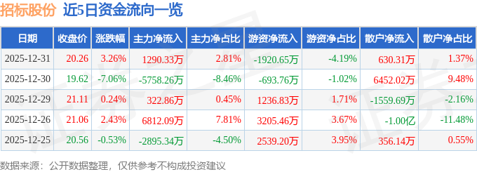 证券之星消息,截至2025年12月31日收盘,招标股份(301136)报收于20.26元,上涨3.26%,换手率8.28%,成交量22.78万手,成交额4.59亿元。