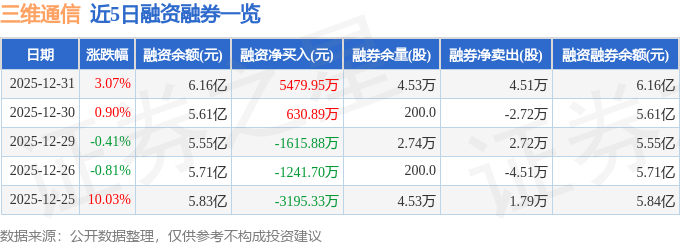 三维通信融资融券信息显示,融资方面,当日融资买入1.85亿元,融资偿还1.3亿元,融资净买入5479.95万元。融券方面,融券卖出4.51万股,融券偿还0.0股,融券余量4.53万股,融券余额57.71万元。融资融券余额6.16亿元。