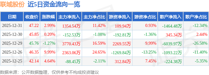 证券之星消息,截至2025年12月31日收盘,联域股份(001326)报收于47.22元,上涨2.99%,换手率10.51%,成交量2.53万手,成交额1.19亿元。