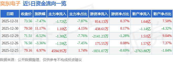 证券之星消息,截至2025年12月31日收盘,奕东电子(301123)报收于73.56元,下跌7.47%,换手率12.23%,成交量28.57万手,成交额21.82亿元。