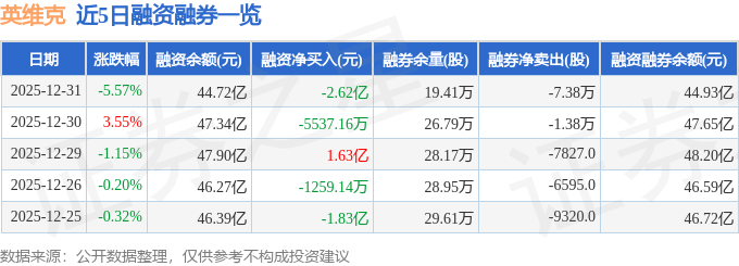 英维克融资融券信息显示,融资方面,当日融资买入7.3亿元,融资偿还9.92亿元,融资净偿还2.62亿元。融券方面,融券卖出8300.0股,融券偿还8.21万股,融券余量19.41万股,融券余额2074.31万元。融资融券余额44.93亿元。