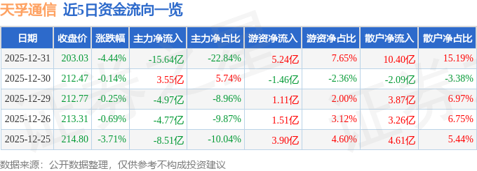 证券之星消息,截至2025年12月31日收盘,天孚通信(300394)报收于203.03元,下跌4.44%,换手率4.3%,成交量33.35万手,成交额68.5亿元。
