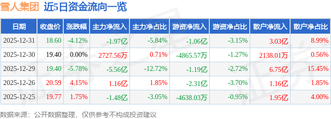 证券之星消息,截至2025年12月31日收盘,雪人集团(002639)报收于18.6元,下跌4.12%,换手率27.76%,成交量180.64万手,成交额33.75亿元。