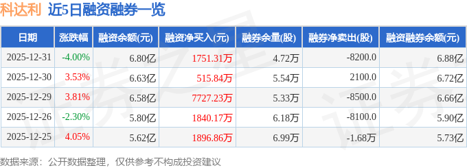 科达利融资融券信息显示,融资方面,当日融资买入1.18亿元,融资偿还1.0亿元,融资净买入1751.31万元,连续3日净买入累计9994.37万元。融券方面,融券卖出3800.0股,融券偿还1.2万股,融券余量4.72万股,融券余额744.86万元。融资融券余额6.88亿元。