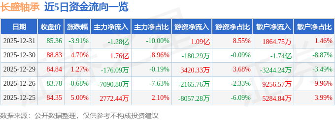 证券之星消息,截至2025年12月31日收盘,长盛轴承(300718)报收于85.36元,下跌3.91%,换手率7.72%,成交量14.96万手,成交额12.81亿元。