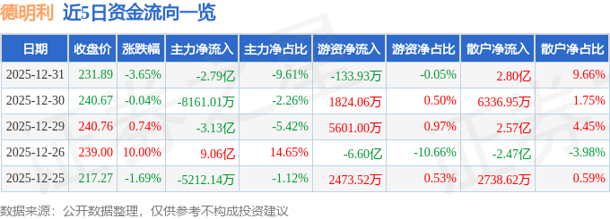 证券之星消息,截至2025年12月31日收盘,德明利(001309)报收于231.89元,下跌3.65%,换手率7.77%,成交量12.5万手,成交额29.05亿元。