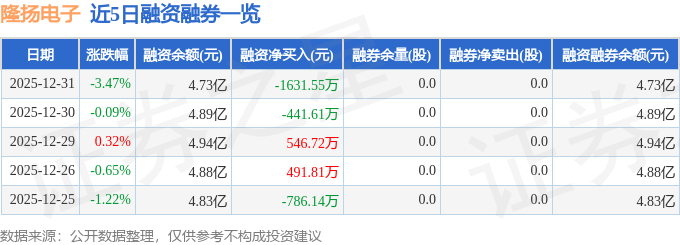 隆扬电子融资融券信息显示,融资方面,当日融资买入2786.34万元,融资偿还4417.88万元,融资净偿还1631.55万元。融券方面,融券卖出0.0股,融券偿还0.0股,融券余量0.0股,融券余额0.0万元。融资融券余额4.73亿元。