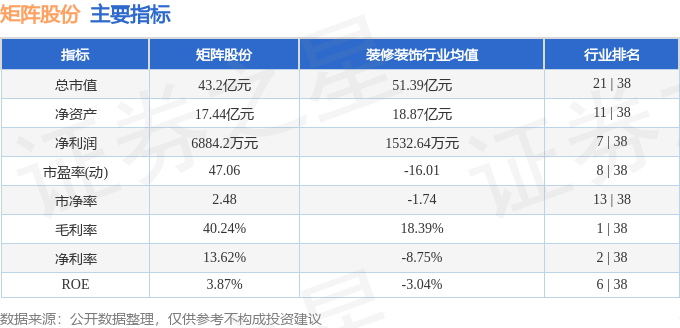 矩阵股份2025年三季报显示,前三季度公司主营收入5.06亿元,同比上升32.12%;归母净利润6884.2万元,同比上升53.97%;扣非净利润4961.9万元,同比上升58.45%;其中2025年第三季度,公司单季度主营收入2.06亿元,同比上升58.71%;单季度归母净利润2834.51万元,同比上升32.46%;单季度扣非净利润1807.97万元,同比上升14.6%;负债率19.63%,投资收益1182.77万元,财务费用-857.2万元,毛利率40.24%。矩阵股份(301365)主营业务:主要从事空间设计与软装陈设业务。