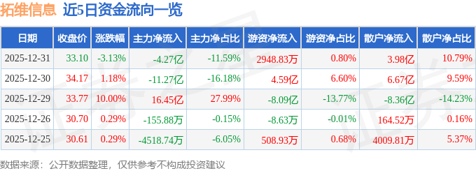 证券之星消息,截至2025年12月31日收盘,拓维信息(002261)报收于33.1元,下跌3.13%,换手率9.61%,成交量110.13万手,成交额36.86亿元。