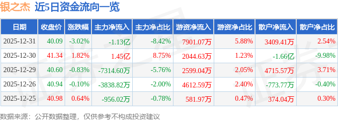 证券之星消息,截至2025年12月31日收盘,银之杰(300085)报收于40.09元,下跌3.02%,换手率5.08%,成交量33.11万手,成交额13.44亿元。