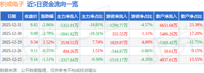 证券之星消息,截至2025年12月31日收盘,积成电子(002339)报收于8.82元,下跌2.86%,换手率6.69%,成交量32.02万手,成交额2.85亿元。