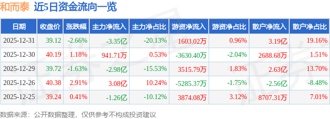 证券之星消息,截至2025年12月31日收盘,和而泰(002402)报收于39.12元,下跌2.66%,换手率5.26%,成交量42.37万手,成交额16.65亿元。