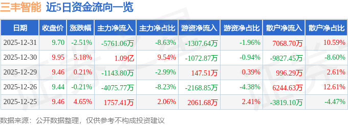 证券之星消息,截至2025年12月31日收盘,三丰智能(300276)报收于9.7元,下跌2.51%,换手率6.51%,成交量68.79万手,成交额6.67亿元。