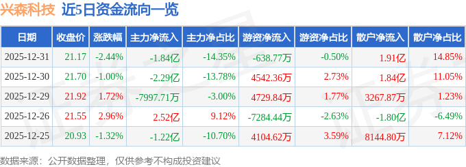 证券之星消息,截至2025年12月31日收盘,兴森科技(002436)报收于21.17元,下跌2.44%,换手率3.98%,成交量60.16万手,成交额12.84亿元。