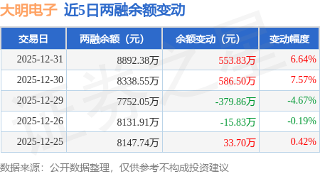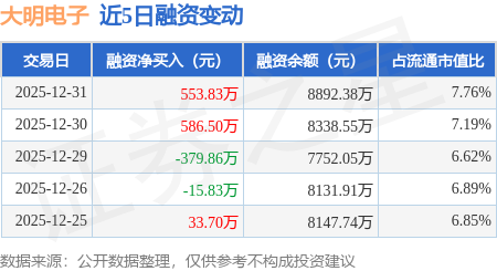 证券之星消息,12月31日,大明电子(603376)融资买入1285.28万元,融资偿还731.44万元,融资净买入553.83万元,融资余额8892.38万元。