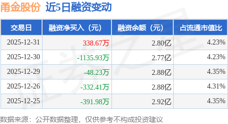 证券之星消息,12月31日,甬金股份(603995)融资买入1167.17万元,融资偿还828.5万元,融资净买入338.67万元,融资余额2.8亿元。