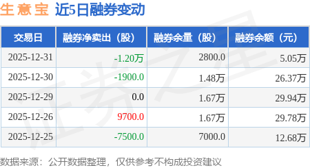 证券之星消息,12月31日,生 意 宝(002095)融资买入1187.86万元,融资偿还1011.61万元,融资净买入176.25万元,融资余额2.6亿元。