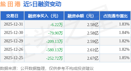 证券之星消息,12月31日,盐 田 港(000088)融资买入636.76万元,融资偿还642.98万元,融资净卖出6.22万元,融资余额2.58亿元。