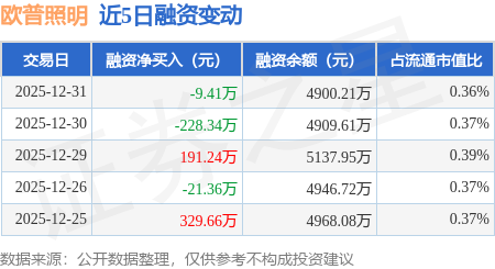 证券之星消息,12月31日,欧普照明(603515)融资买入242.71万元,融资偿还252.12万元,融资净卖出9.41万元,融资余额4900.21万元,近20个交易日中有11个交易日出现融资净买入。