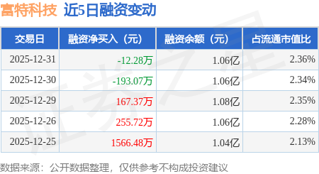 证券之星消息,12月31日,富特科技(301607)融资买入974.22万元,融资偿还986.5万元,融资净卖出12.28万元,融资余额1.06亿元。