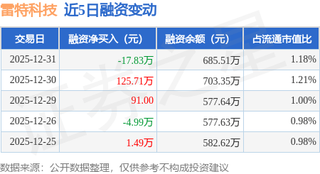 证券之星消息,12月31日,雷特科技(920110)融资买入17.51万元,融资偿还35.35万元,融资净卖出17.83万元,融资余额685.51万元,近20个交易日中有13个交易日出现融资净买入。