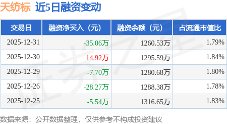 证券之星消息,12月31日,天纺标(920753)融资买入20.34万元,融资偿还55.4万元,融资净卖出35.06万元,融资余额1260.53万元。