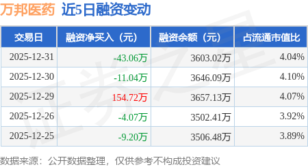 证券之星消息,12月31日,万邦医药(301520)融资买入143.16万元,融资偿还186.22万元,融资净卖出43.06万元,融资余额3603.02万元。