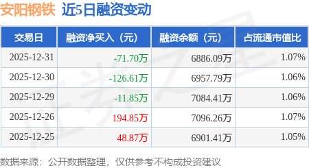 证券之星消息,12月31日,安阳钢铁(600569)融资买入181.96万元,融资偿还253.66万元,融资净卖出71.7万元,融资余额6886.09万元。
