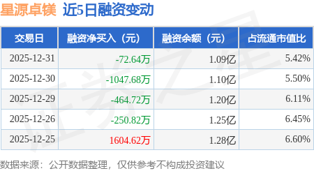 证券之星消息,12月31日,星源卓镁(301398)融资买入1714.74万元,融资偿还1787.38万元,融资净卖出72.64万元,融资余额1.09亿元。