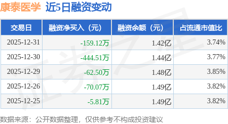 证券之星消息,12月31日,康泰医学(300869)融资买入286.34万元,融资偿还445.46万元,融资净卖出159.12万元,融资余额1.42亿元。