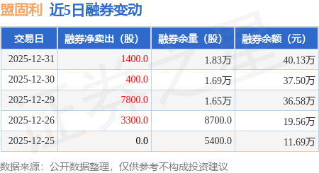 证券之星消息,12月31日,盟固利(301487)融资买入1857.51万元,融资偿还2019.42万元,融资净卖出161.91万元,融资余额3.6亿元。