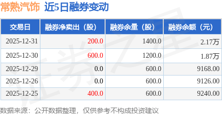 证券之星消息,12月31日,常熟汽饰(603035)融资买入1088.65万元,融资偿还1274.77万元,融资净卖出186.12万元,融资余额3.31亿元,近20个交易日中有11个交易日出现融资净买入。