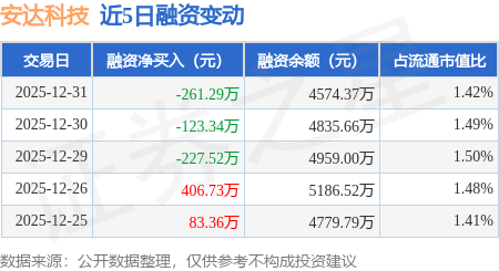 证券之星消息,12月31日,安达科技(920809)融资买入193.14万元,融资偿还454.43万元,融资净卖出261.29万元,融资余额4574.37万元。