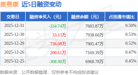 证券之星消息,12月31日,奥赛康(002755)融资买入276.58万元,融资偿还611.32万元,融资净卖出334.74万元,融资余额7603.87万元。