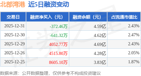 证券之星消息,12月31日,北部湾港(000582)融资买入5017.2万元,融资偿还5389.66万元,融资净卖出372.46万元,融资余额4.59亿元,近20个交易日中有11个交易日出现融资净买入。