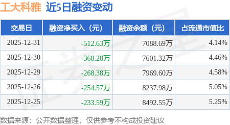证券之星消息,12月31日,工大科雅(301197)融资买入476.75万元,融资偿还989.38万元,融资净卖出512.63万元,融资余额7088.69万元。