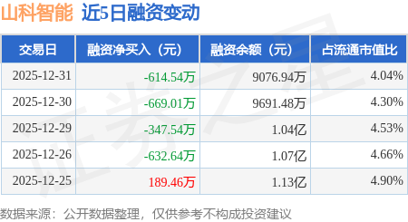 证券之星消息,12月31日,山科智能(300897)融资买入249.68万元,融资偿还864.22万元,融资净卖出614.54万元,融资余额9076.94万元。