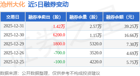证券之星消息,12月31日,沧州大化(600230)融资买入3552.23万元,融资偿还4204.02万元,融资净卖出651.79万元,融资余额2.65亿元。