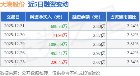 证券之星消息,12月31日,大港股份(002077)融资买入1043.34万元,融资偿还1732.12万元,融资净卖出688.78万元,融资余额2.8亿元。