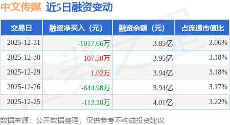 证券之星消息,12月31日,中文传媒(600373)融资买入1141.28万元,融资偿还2158.94万元,融资净卖出1017.66万元,融资余额3.85亿元,近20个交易日中有16个交易日出现融资净买入。
