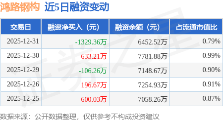 证券之星消息,12月31日,鸿路钢构(002541)融资买入1377.63万元,融资偿还2706.99万元,融资净卖出1329.36万元,融资余额6452.52万元,近20个交易日中有13个交易日出现融资净买入。