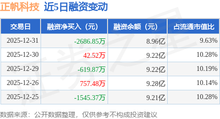证券之星消息,12月31日,正帆科技(688596)融资买入7325.81万元,融资偿还1.0亿元,融资净卖出2686.85万元,融资余额8.96亿元。