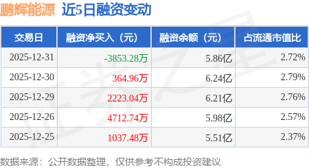 证券之星消息,12月31日,鹏辉能源(300438)融资买入7700.27万元,融资偿还1.16亿元,融资净卖出3853.28万元,融资余额5.86亿元,近20个交易日中有12个交易日出现融资净买入。