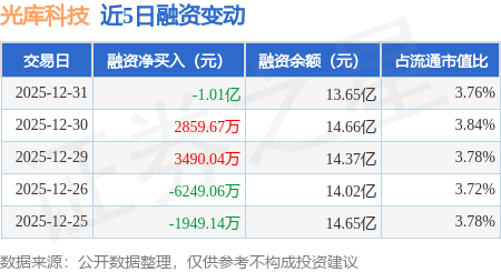 证券之星消息,12月31日,光库科技(300620)融资买入1.86亿元,融资偿还2.87亿元,融资净卖出1.01亿元,融资余额13.65亿元,近20个交易日中有12个交易日出现融资净买入。
